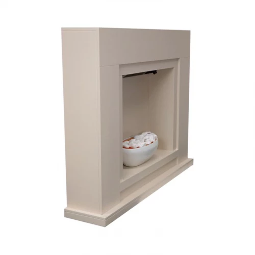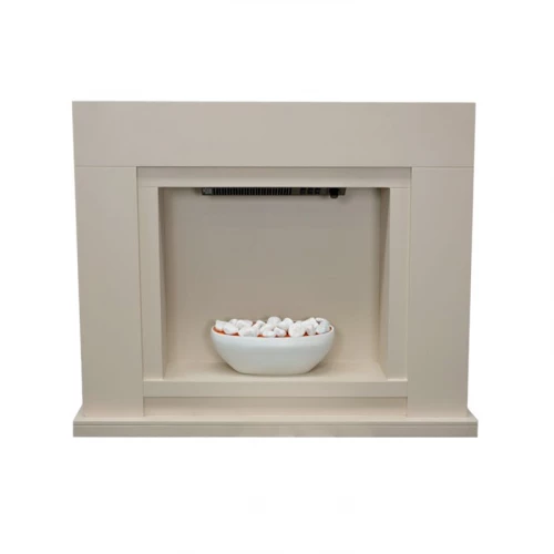 Large, elegant electric fireplace designed as a classic english fireplace, with a white oval decoration bowl with beautiful decorative white stones inserted. The light from the bowl gives a soft light and a nice view of the flames in the fireplace.