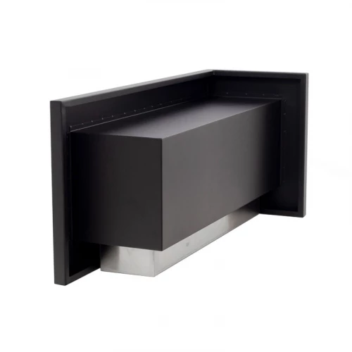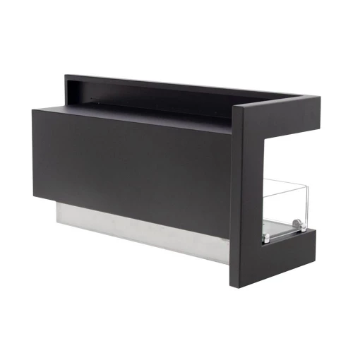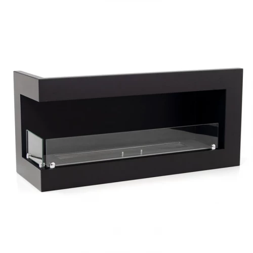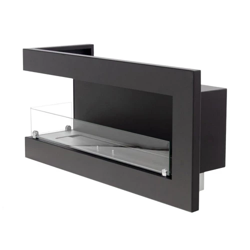 Here you get a left-facing corner fireplace for installation in a wal. This model allows you to see the flames from two sides of the wall. The bio fireplace is produced in steel, which has been powder coated in black. Two pieces of safety glass are attached to the fireplace, which shield the flames from draft wind and gusts of wind.