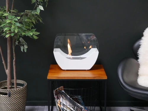 Bioethanol fireplace to set free on any table. It is made in white with safety glass on both sides. A smart and refined bio fireplace that is modern and unique. With its curved glass and white, wide bottom, this bio fireplace awakens in its modern surroundings. Bio fires does not emit smoke or soot so the cleaning and maintenance is a child’s play.