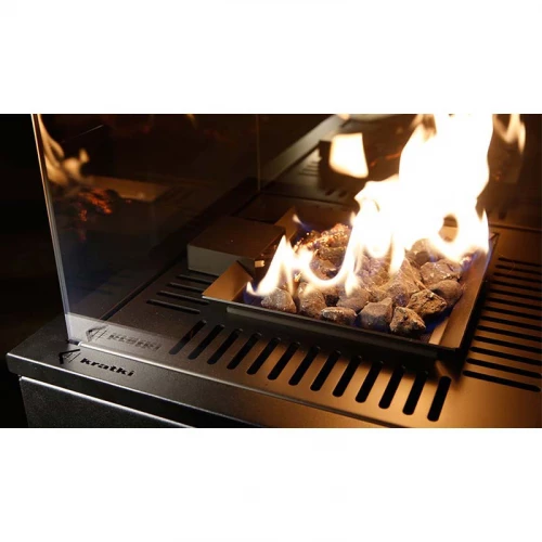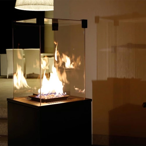 The fireplace is powered by a liquid gas from the bottle. The flames are sealed inside a glass cell, ensuring that you are never in a direct contact with the fire. The gas fireplace is designed to distribute heat into four directions. It is equipped in a special steering valve which, in case of unit overturning, will disconnect the gas supply from the controller.