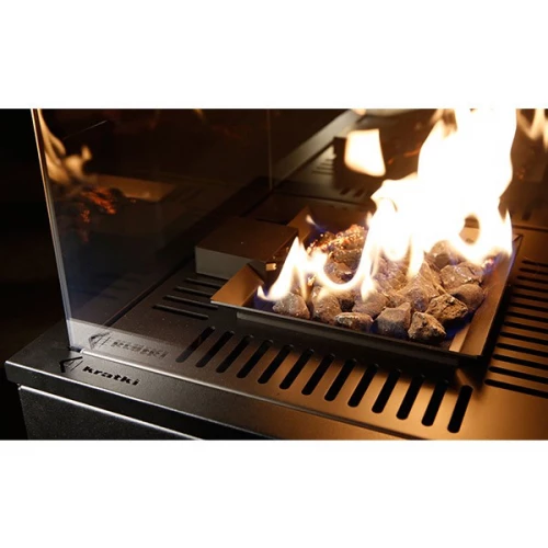 The fireplace is powered by a liquid gas from the bottle. The flames are sealed inside a glass cell, ensuring that you are never in a direct contact with the fire. The gas fireplace is designed to distribute heat into four directions. It is equipped in a special steering valve which, in case of unit overturning, will disconnect the gas supply from the controller.