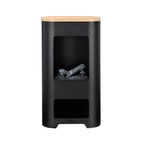 The fireplace is made of steel and has a wooden top plate. The flames are created by a Dimplex Opti-myst Cassette, which uses water and light to create a fantastic flame effect.