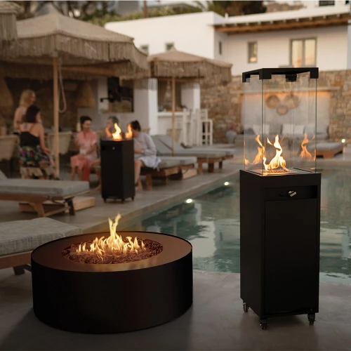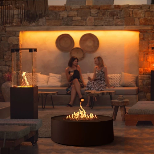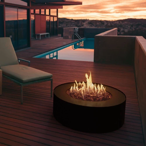 - Large round outdoor gas fireplace with a star-shaped gas burner