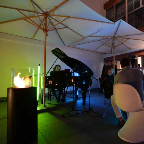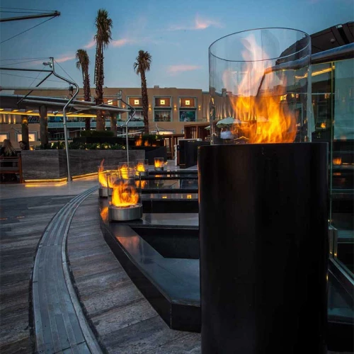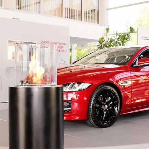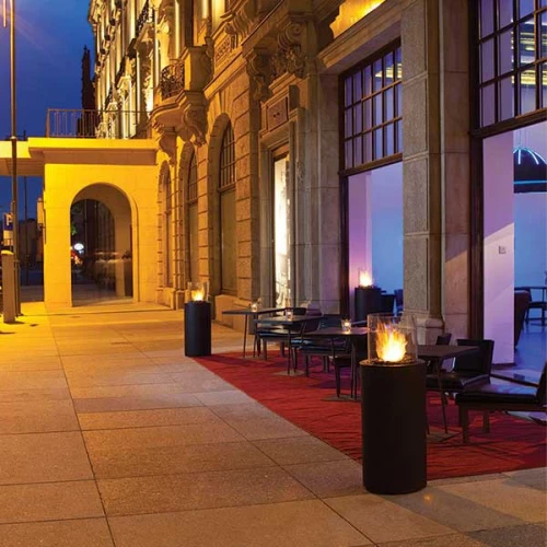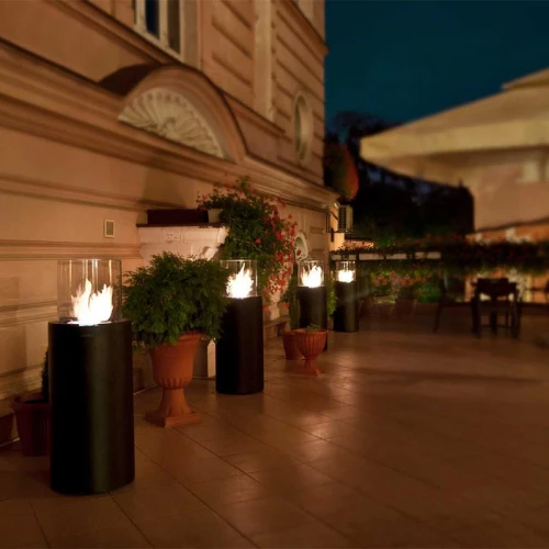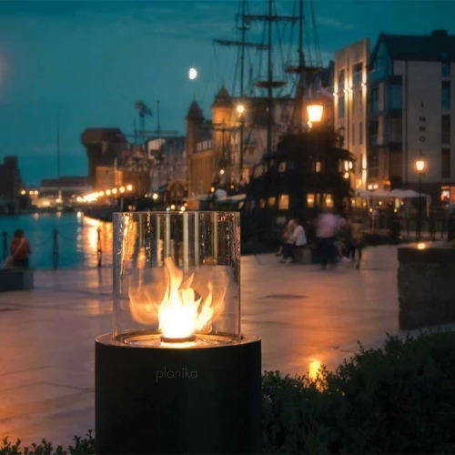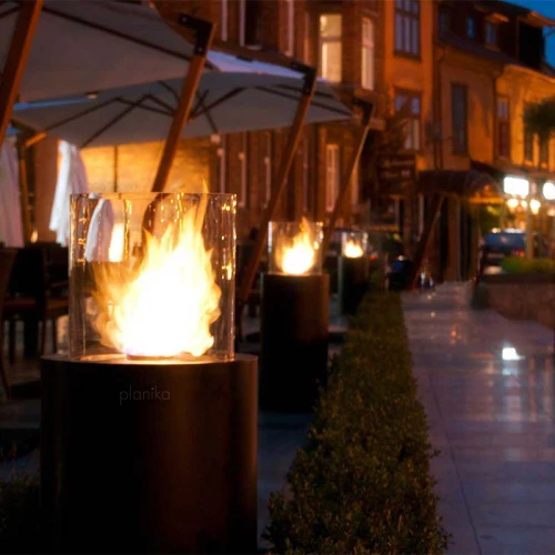 This outdoor bioethanol fireplace is from the manufacturer Planika. The fireplace can be used both indoor and outdoor, and thanks to the glass cylinder around the fire, it is possible to admire the flames from any side. The glass is also great when bringing the fire outside as it shields from wind.