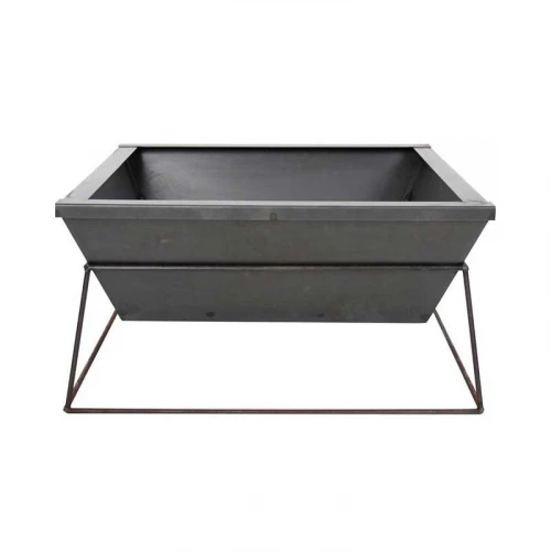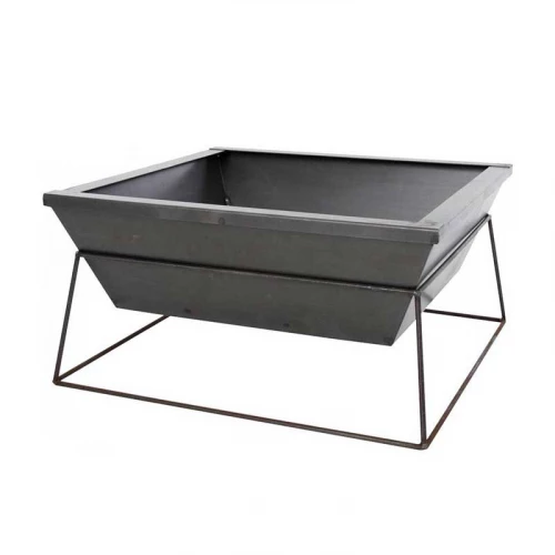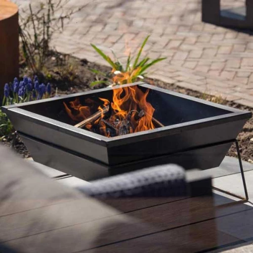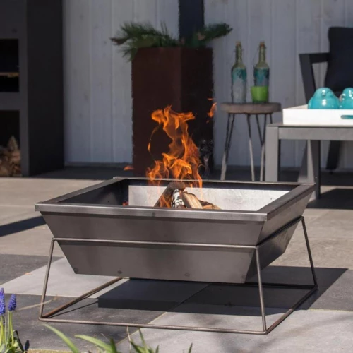Square Reso firepit in a modern and sturdy design. This fireplace can be used in 2 different heights, as the base can be turned so that the firepit gets closer to the ground.