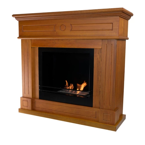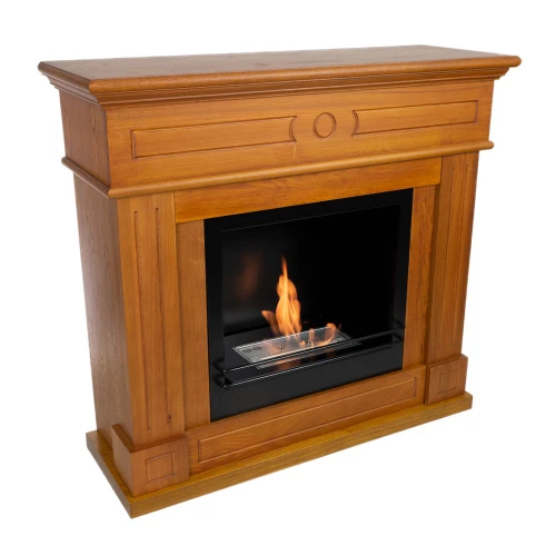 Large freestanding bioethanol fireplace in a traditional bioethanol fire suite look. The fireplace frame is made of wood and kept in a natural oiled colour.